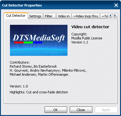 This filter implements cut detection on a video stream. It is based on work done by me, using dedicated hardware, around 1980 and was published in BBC RD 1984/7 so it is safely out of patent coverage. Jim Easterbrook did the first C++ DirectShow implementation. My implementation is more or less the same but uses Delphi, has some additional property pages and allows a video loop-through that need not be connected.